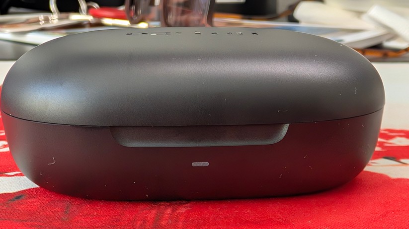 Das Case besteht aus Kunststoff, aber die Oberfläche erinnert an raues Leder. Eine kleine LED informiert über den Ladezustand von Case und Kopfhörern, während sich der Anschluss für ein USB-C-Ladekabel auf der Rückseite befindet, das allerdings nicht im Lieferumfang enthalten ist. Das Scharnier der Hülle macht ebenso wie das Ladecase selbst einen ordentlich verarbeiteten Eindruck. Die Hülle ist robust genug, um Stürze aus anderthalb Metern Höhe auf Steinboden zu überstehen, aber die Kopfhörer fallen dann aus dem geöffneten Case. Die Kopfhörer sind nach IP54-Standard gegen Schmutz und Spritzwasser geschützt.