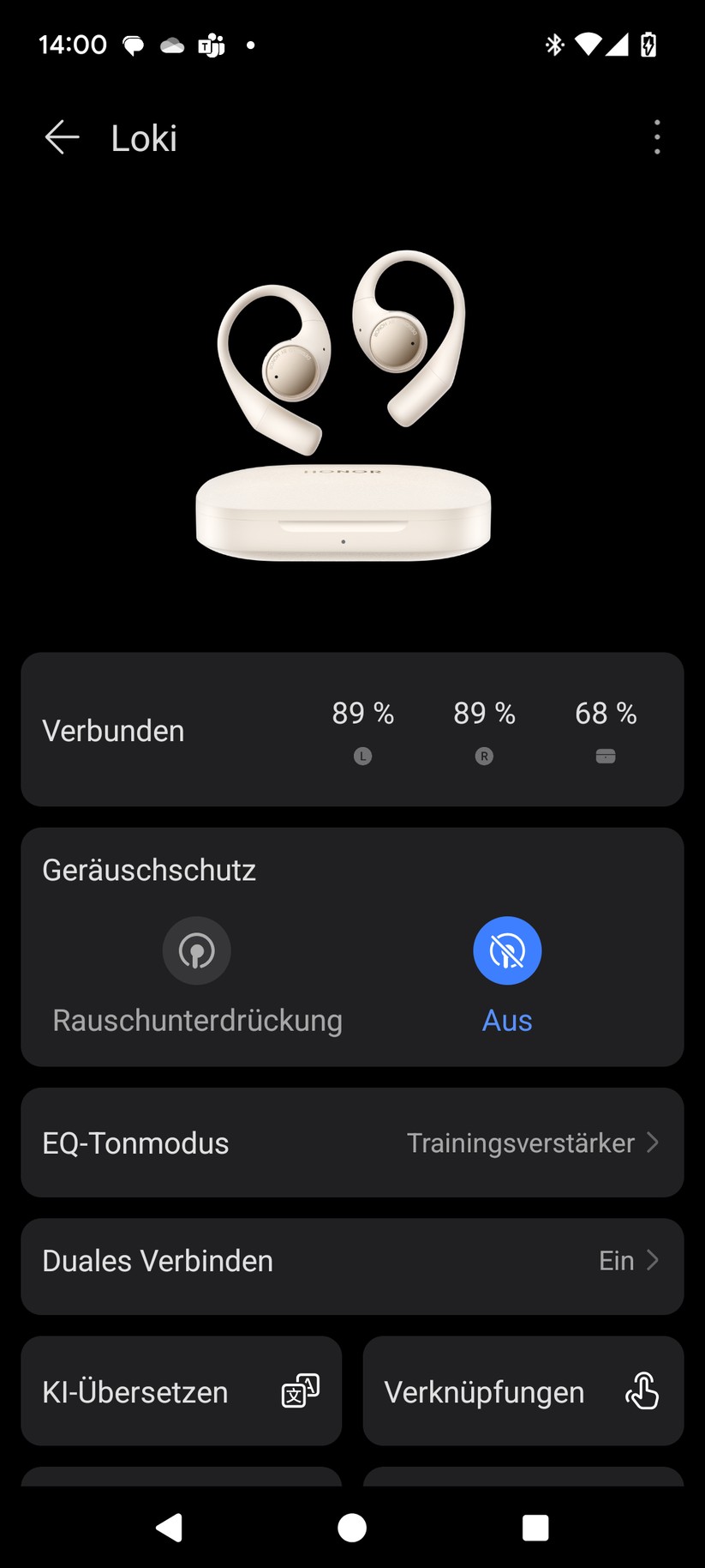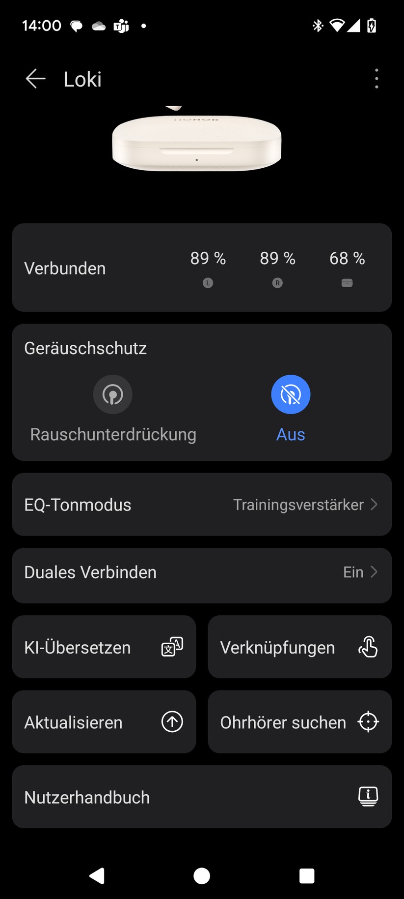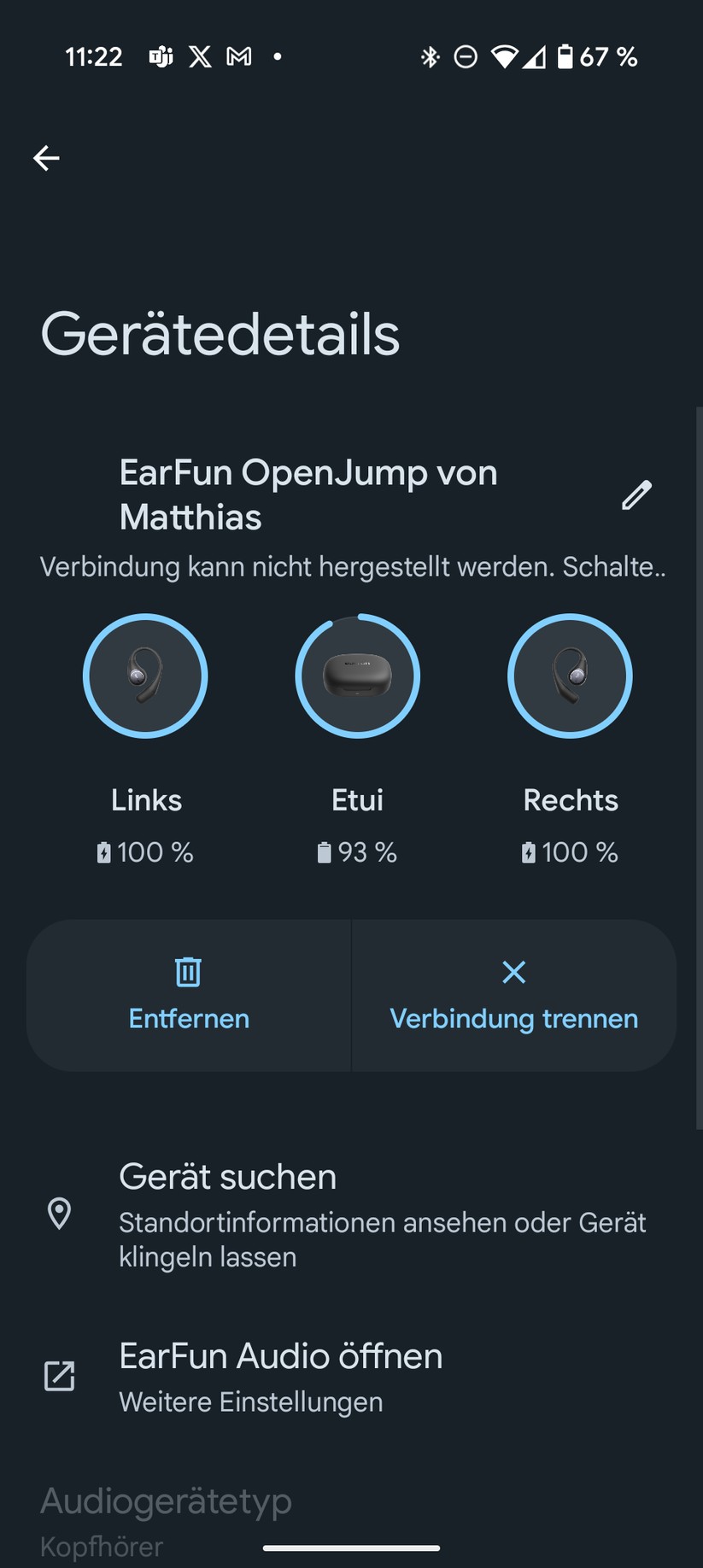 Bei der Akkulaufzeit muss man ebenfalls Abstriche machen, denn die liegt laut Herstellerangaben lediglich bei sechs Stunden. Mit Ladecase erhöht sich die Betriebsdauer auf 22 Stunden, wobei das Aufladen der Earbuds 75 Minuten dauert. Die Akkulaufzeit, die wir bei mittlerer Lautstärke in unserem Test bestätigen können, liegt damit für Kopfhörer dieser Art eher im unteren Bereich. Besser schneiden hier etwa die Nothing Ear (Open) mit acht Stunden ab.