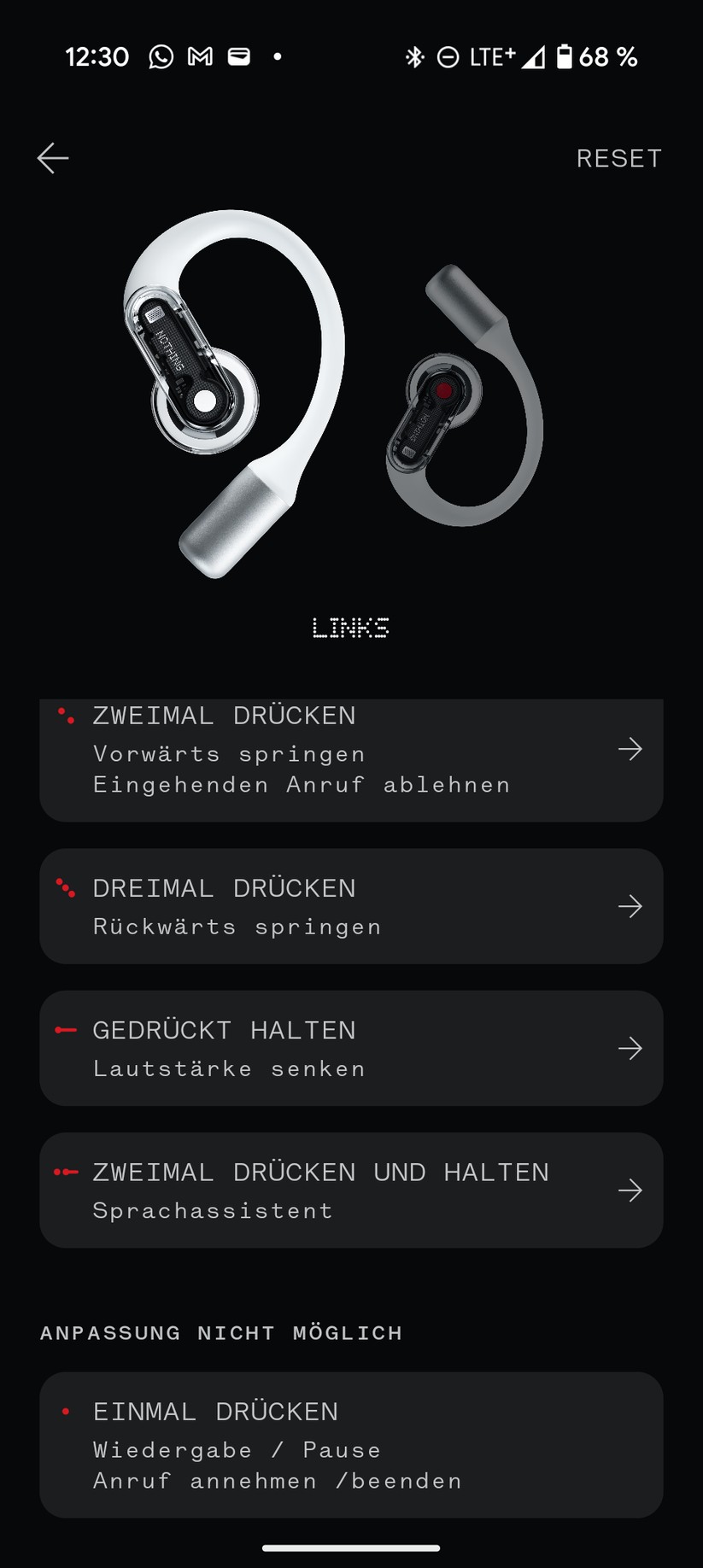Die Steuerung an den Ohrhörern ist auf das Wesentliche reduziert und lässt sich leicht anpassen. Die Werksvoreinstellung ist bereits sehr sinnvoll. An beiden Ohrhörern sitzt ein kleiner, gut ertastbarer physischer Knopf. Dreifach-Klicks erfordern etwas Timing, aber nach kurzer Eingewöhnung funktioniert alles zuverlässig. Die beim Vorgänger vermisste Lautstärkeregelung direkt am Ohrhörer ist nun vorhanden: langer Druck rechts für lauter, links für leiser.