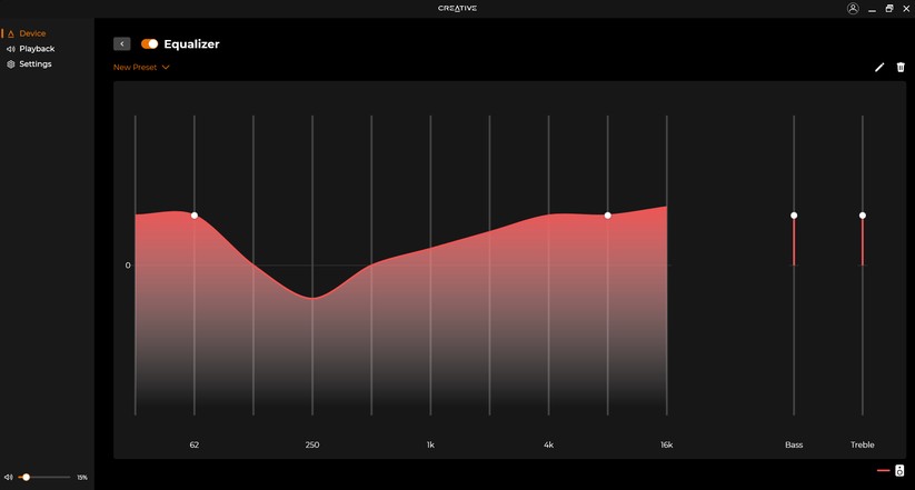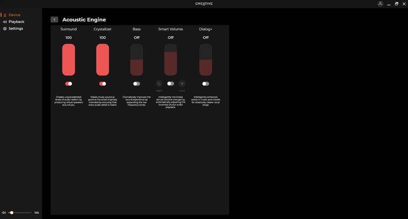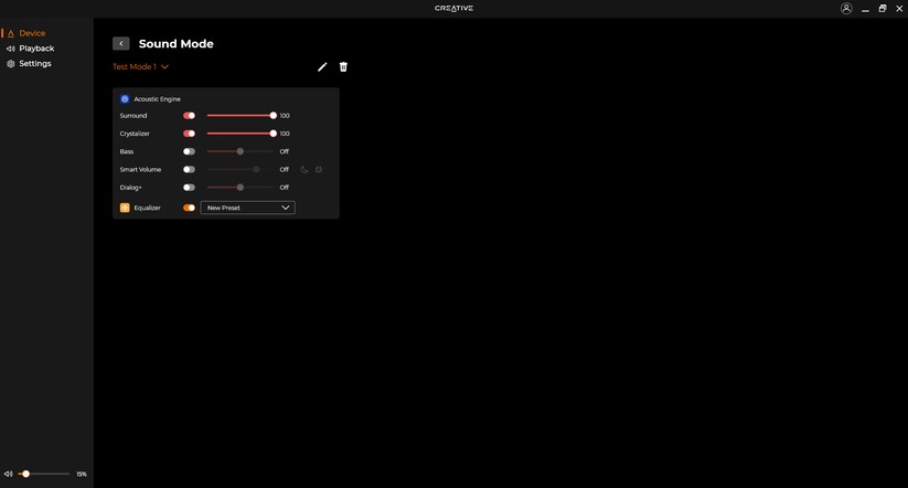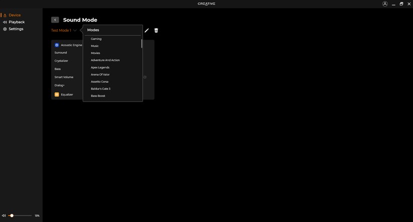 Die Creative-App am PC bietet einige Möglichkeiten, um das Soundbild der Lautsprecher zu konfigurieren. Allen voran der sogenannte Sound-Mode. Hier wählt man entweder aus einem bereits vorhandenen Profil oder erstellt sein eigenes. Vorgefertigte Profile reichen von generischen Bezeichnungen wie Movies, Gaming oder Music bis hin zu eigens für bestimmte Spiele erstellte Profile wie etwa Baldur's Gate 3 oder Cyberpunk 2077. Über die sogenannte Acoustic Engine schaltet man jetzt verschiedene Funktionen wie Surround-Sound, Bass und mehr hinzu und verändert sie den eigenen Anforderungen entsprechend. Mittels des Equalizers passt man zudem noch Bass und Treble an.