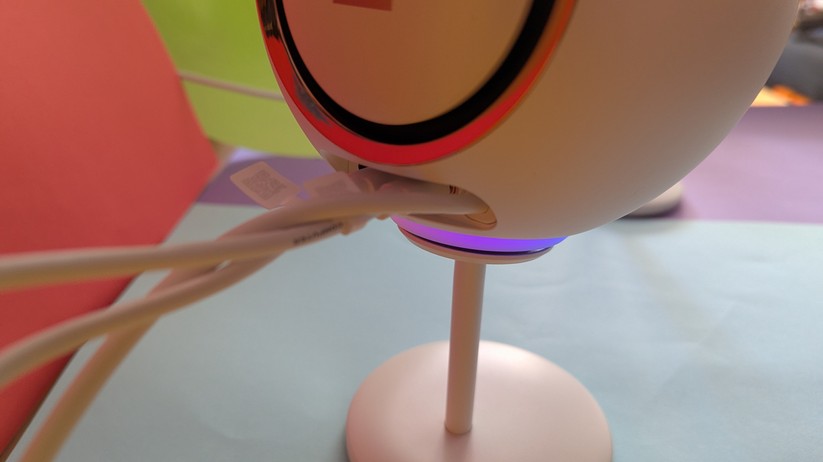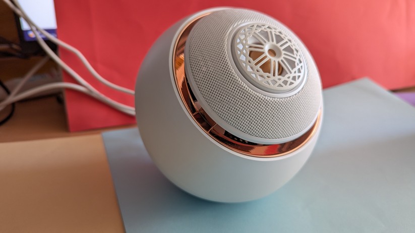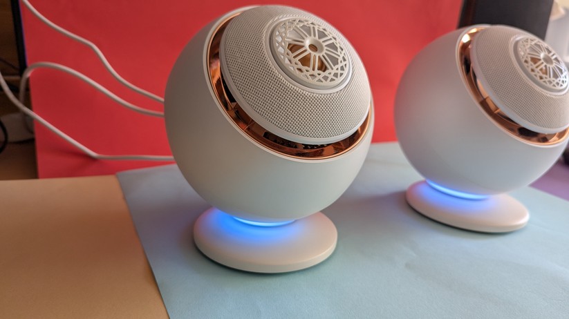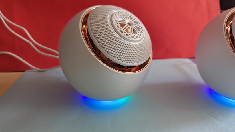 Anders als die meisten Lautsprecher, die in eckiger Form daherkommen, sind die Creative Pebble Nova sphärenförmig. Farblich wählt man zwischen einer weißen und einer schwarzen Variante. Unser Testsample ist weiß, mit kupferfarbenen Akzenten, die die Öffnung der Lautsprecher auskleiden. An der Unterseite befinden sich LEDs, mit denen die Speaker fröhlich vor sich her leuchten. Stört einen die Festbeleuchtung, schaltet man die Lichter am Gerät oder mittels der App aus.