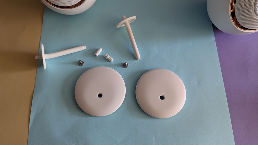 Für den Halt der beiden Lautsprecher sorgen zwei beschwerte Füße aus Metall. Die benötigten Schrauben, um den Aufsatz mit dem Fuß zu befestigen, sind inkludiert. Man braucht jedoch einen Schraubendreher, denn dieser ist nicht im Lieferumfang enthalten. Anschließend steckt man die Sphären auf den nun aus dem Fuß hervorragenden Aufsatz. Zwei Verlängerungsarme, die man zwischen Fuß und Lautsprecher schrauben kann, gibt es ebenfalls.