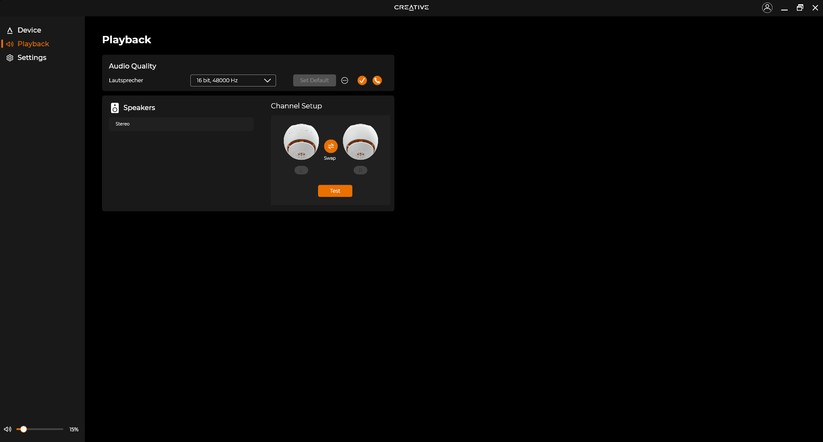 Praktisch: Über das Playback-Menü richtet man den linken und rechten Lautsprecher unabhängig von deren physischer Position auf dem Schreibtisch ein. In unserem Fall mussten wir den Hauptlautsprecher auf die linke Seite stellen, weil sonst die Kabel nicht bis hin zur Steckerleiste gereicht hätten. Dieser ist standardmäßig jedoch der rechte Lautsprecher. Dank der Software weisen wir ihm unkompliziert mit einem Klick die linke Position zu.