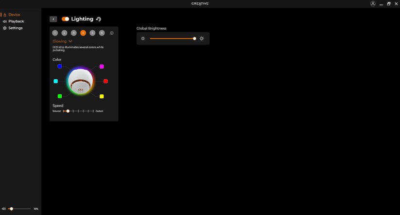 Für die Beleuchtung der Lautsprecher gibt es ebenfalls ein eigenes Menü. Je nach Beleuchtungsmodus variieren hier Einstellungsmöglichkeiten, beschränken sich aber auf Farbauswahl, Helligkeit, Geschwindigkeit und Richtung des Farbverlaufs.