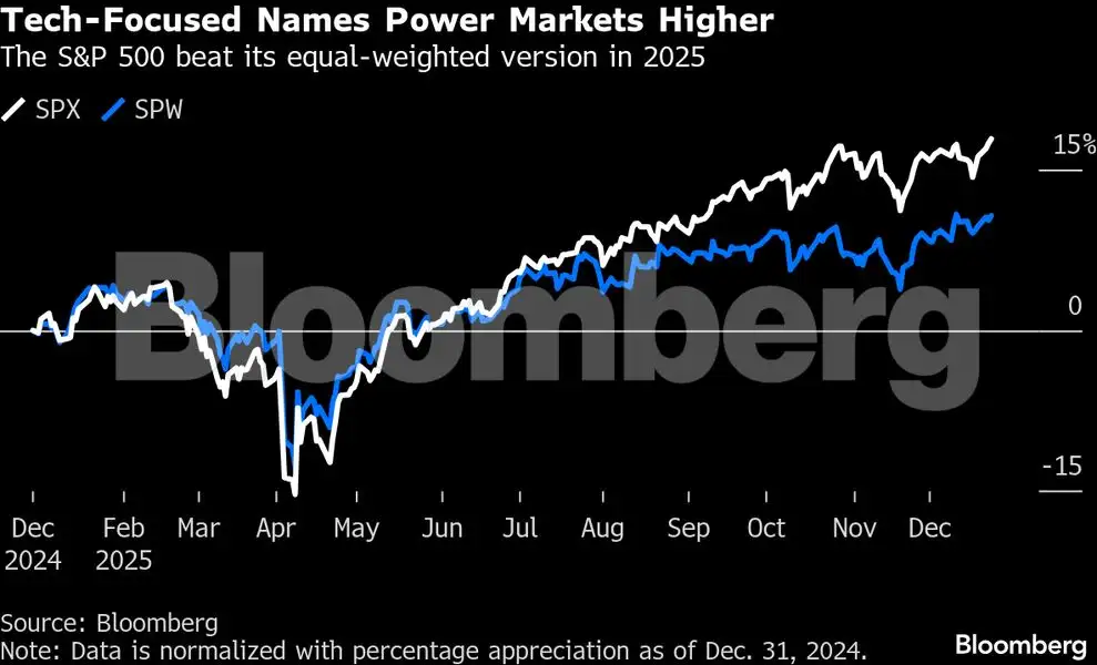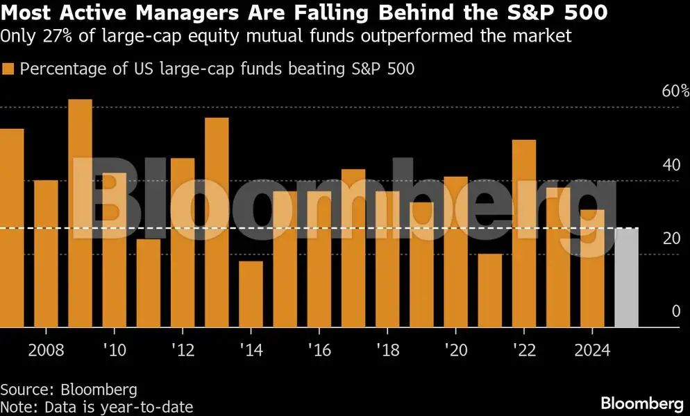 Throughout the year, the S&P 500 outperformed its equal-weighted version, which assigns the same importance to a smallish retailer as it does to Apple. For investors assessing active strategies, that translated into a simple arithmetic problem: Choose one that is underweight the largest stocks and risk falling behind, or go with another that holds them in close proportion to the index, and struggle to justify paying for an approach that is little different than a passive fund. In the US, 73% of equity funds have trailed their benchmarks this year, according BI’s Athanasios Psarofagis, the fourth most in data going back to 2007. The underperformance worsened after the recovery from April’s tariff scare as enthusiasm over artificial intelligence cemented leadership for the tech cohort. There were exceptions, but they required investors to accept very different risks.