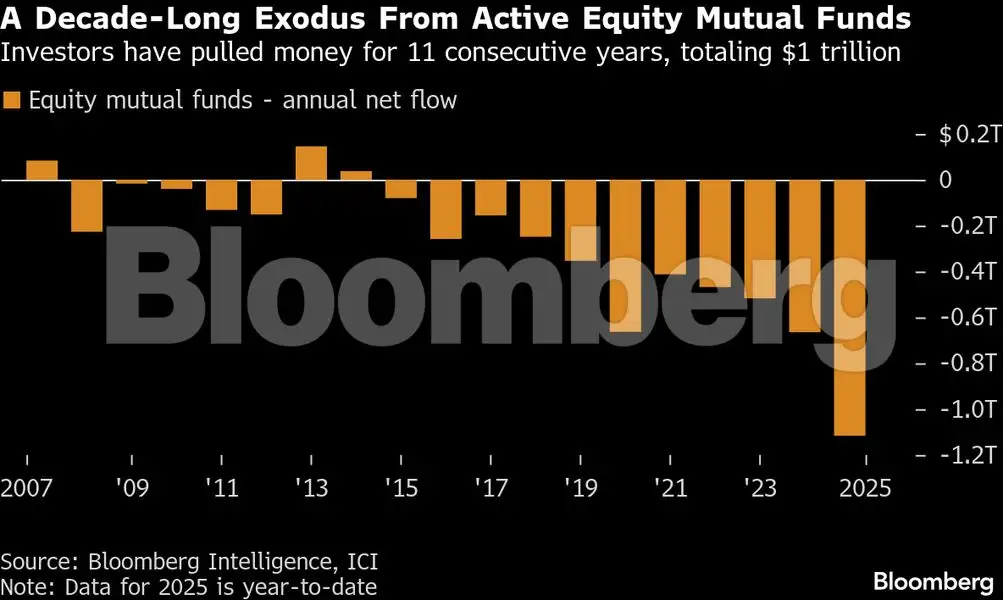 Frustration dictated how money moved. Around $1 trillion was pulled from active equity mutual funds over the year, according to estimates from Bloomberg Intelligence using ICI data, marking an 11th year of net outflows and, by some measures, the steepest of the cycle. By contrast, passive equity exchange-traded funds got more than $600 billion.