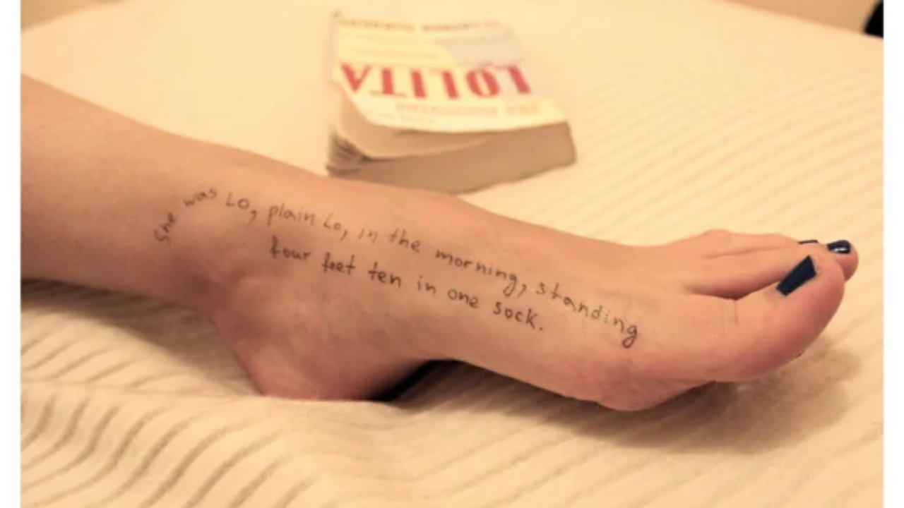 A bowl of novelty condoms branded with Trump’s caricature — “Trump condom 4.50,” promising “I’m HUUUUGE!” — sitting in Epstein’s island home, a frat‑house joke anchored in a place synonymous with alleged abuse.Another photo shows Trump with a group of women, their faces all blacked out, his visible — an almost too‑on‑the‑nose metaphor for how the scandal has played out: the powerful man in full view, the women anonymized by the system.Other images go straight to the core of Epstein’s psychology. Close‑ups of a foot and a neck inked with quotes from “Lolita,” a book about a middle‑aged man’s obsession with a young girl, now literally written on bodies in Epstein’s orbit.