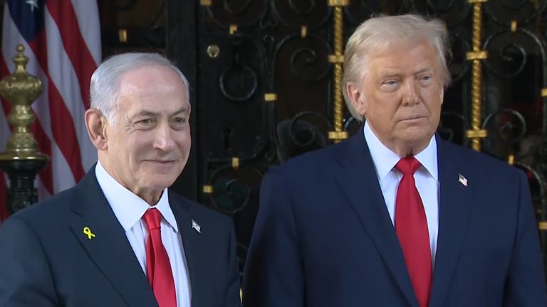 Image: Mr Trump and Benjamin Netanyahu speak outside Mar-a-Lago
