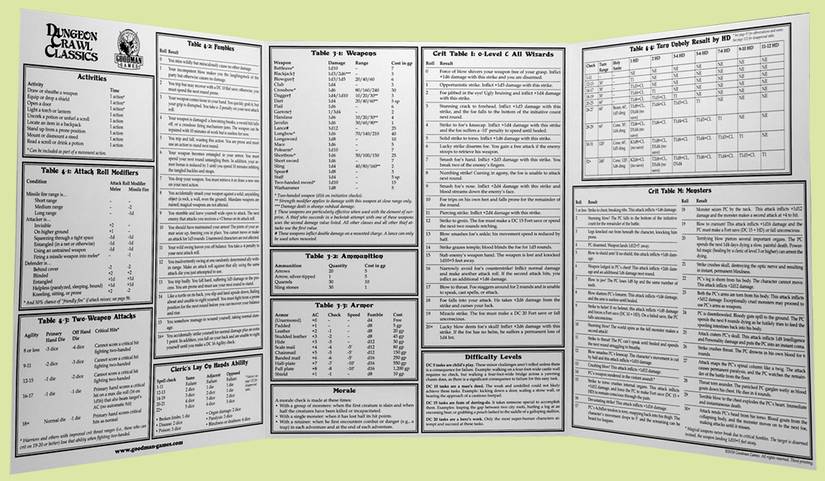 The inside of the Dungeon Crawl Classic Judge Screen, with some of the many tables the game provides
