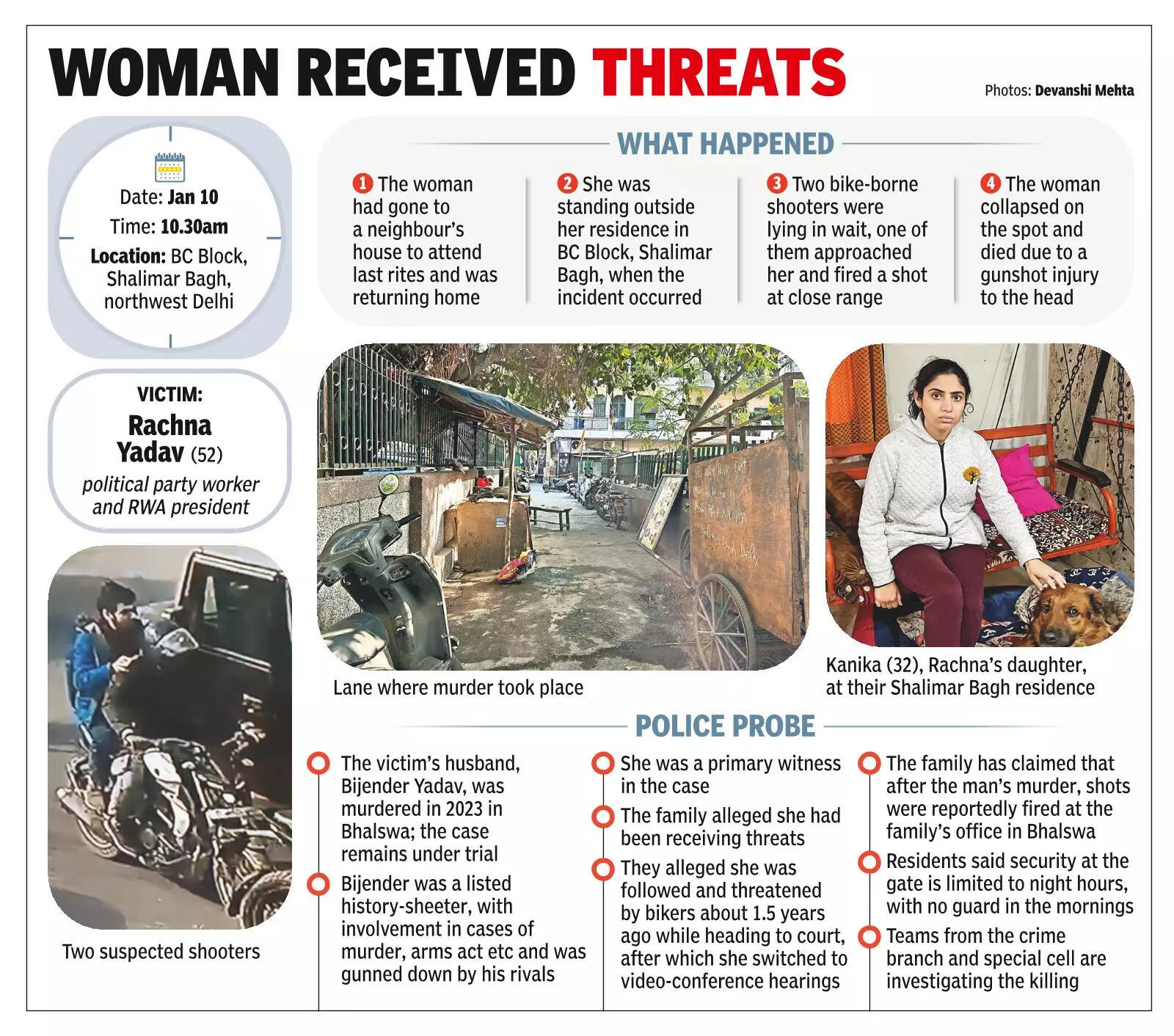 NEW DELHI: Vrinda was only 16 when her father was shot dead. To keep the family afloat, her mother, Rachna Yadav, opened a small shop selling salwar suits. Now, Vrinda and her elder sister have lost her to bullets too.Rachna (52) was the president of her block's residents welfare association and also worked with a party. The family said she was also planning to revive a YouTube-based news portal that was shut after her husband's death. "My mother promised that once I finished my degree, we would turn our shop into an office for the news portal and I would become its anchor," said Vrinda, a journalism student at IP University. Recalling their last conversation, Rachna's elder daughter, 32-year-old Kanika, said, "Just the night before she was killed, she said she wanted to see my daughter.
