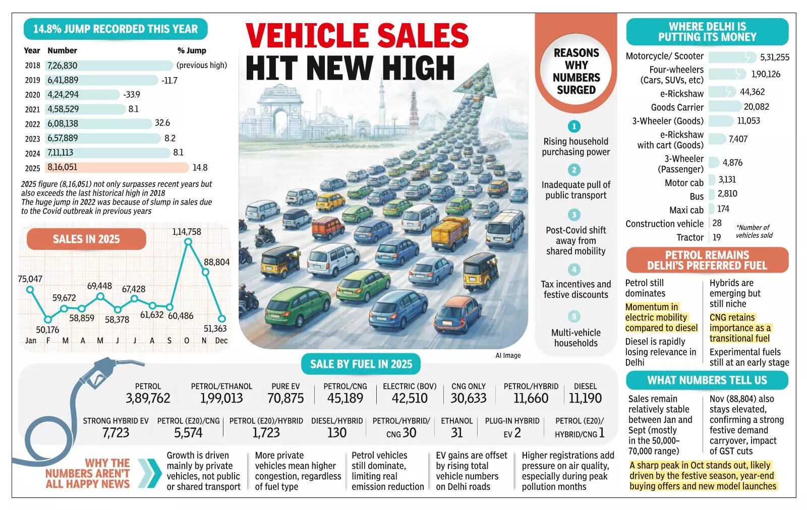 NEW DELHI: The record-breaking vehicle sales in the city in 2025 come with a warning — the growth is overwhelmingly driven by private vehicles, not public or shared transport.Of the 8,16,051 new registrations, around 7.2 lakh were private vehicles, highlighting that most buyers added personal vehicles rather than choosing public transport.
