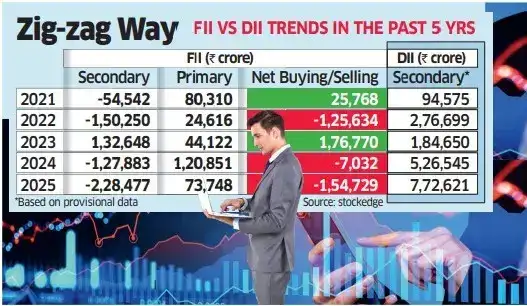 Mumbai: Institutional behaviour in the Indian stock market in 2025 has been marked by sharp contrasts, with overseas investors pulling record money out, while their domestic peers pumped in like never before.