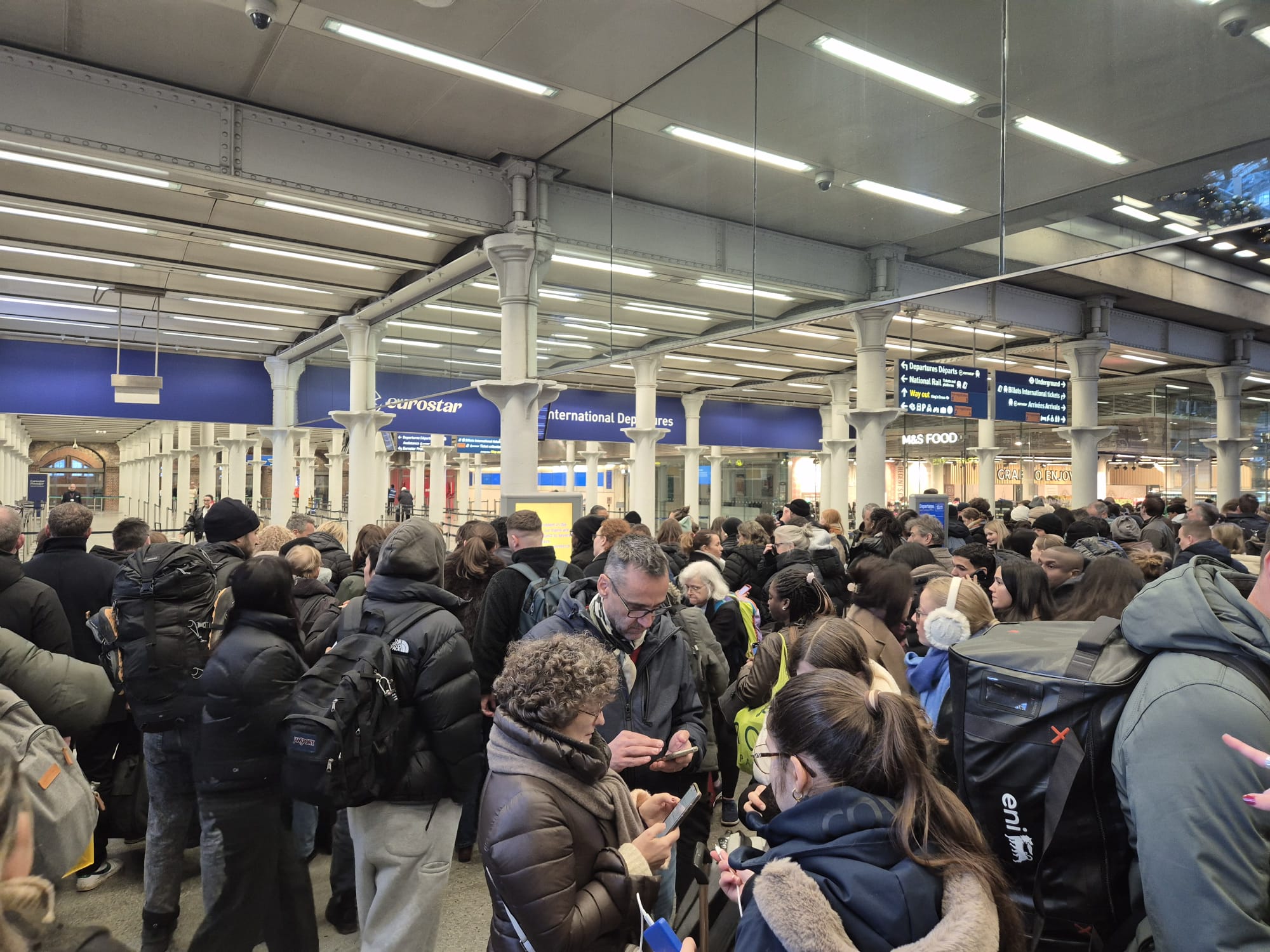 At St Pancras, large crowds were gathered by the check-in area on Tuesday afternoon, local time, where it was clear passengers were starting to become frustrated by the disruption.