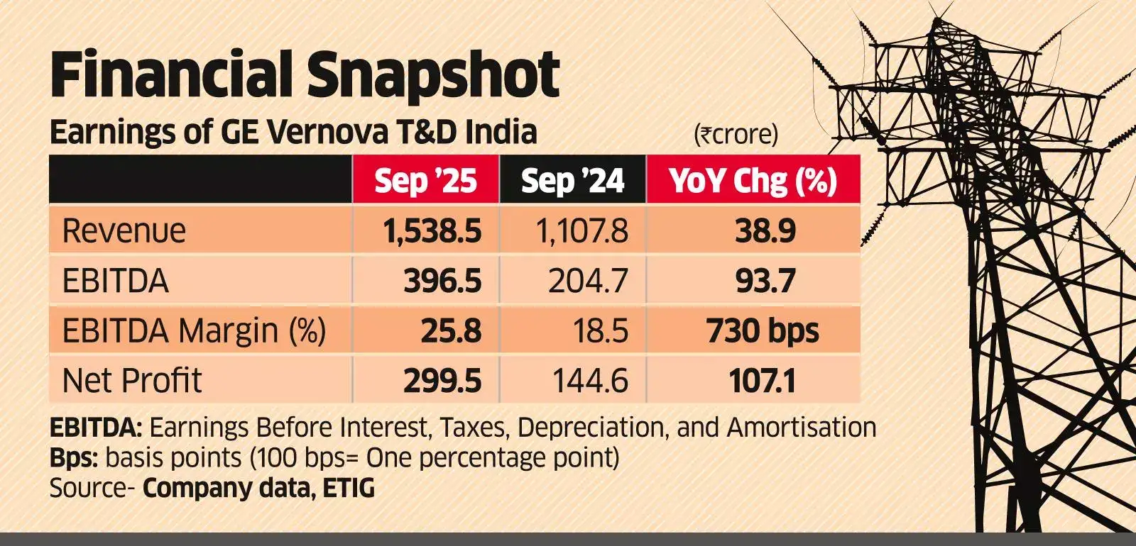 ET Intelligence Group: The shares of GE Vernova T&D India have risen 47% so far this year including 31% gain in six months driven by traction in order pipeline. Such a strong momentum has resulted in a higher trailing price-earnings (P/E) multiple of 86 compared with some of the peers. The premium valuation reflects better expected growth over the next two years, implied by FY28 forward P/E between 44 and 60 calculated by broking firms. The company, which provides products and automation solutions to the power sector, reported its highest-ever order backlog of ₹13,100 crore as of September 2025. It is over three times FY25 revenue of ₹4,292 crore.