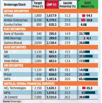 Indian equities face an uncertain start to 2026 after a volatile 2025. While a recovery is expected, lingering trade deal doubts and a lack of new catalysts suggest a stock picker's market. Leading brokerages highlight high-conviction ideas with potential upside between 11.3% and 39%.