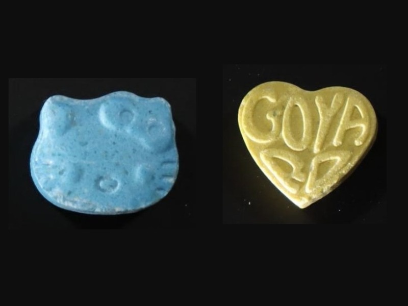The pressed pills come in various shapes and colours, with some featuring pop culture references to cartoon characters Hello Kitty and Rick and Morty.