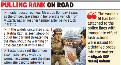 A UP Police sub-inspector, SI Ratna Rathi, was caught on video verbally abusing and threatening a young couple during a traffic jam in Meerut. The officer, reportedly frustrated by the delay, made highly offensive remarks. The incident, recorded by bystanders, has led to an investigation and her attachment to police lines in Aligarh.