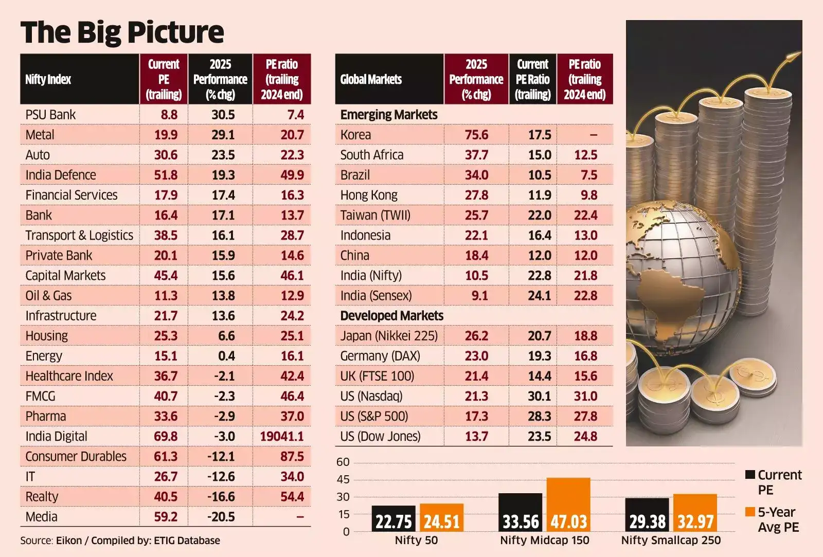 The Nifty is trading at a PE ratio - a key valuation measure - of 22.75 times below its five-year average reading of 24.51, underscoring that valuations are cheaper today. This is a silver lining for Indian markets after a year marked by foreign investor apathy and underperformance.