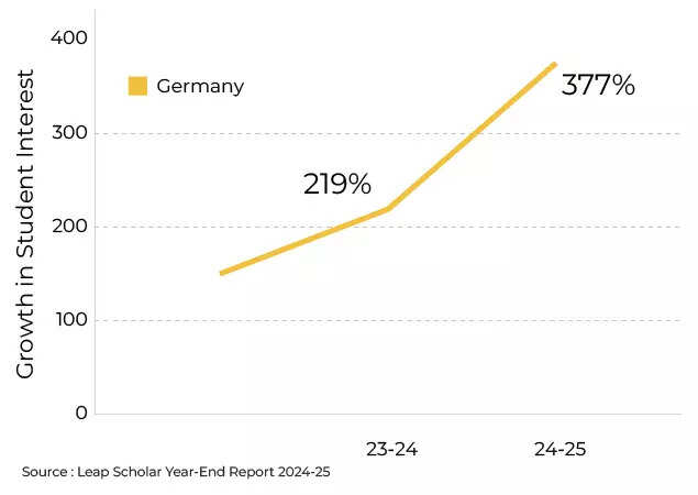 The Leap Scholar report tracks how quickly the pivot is happening: Interest in Germany rose 219% in 2023–24 and then surged 377% in 2024–25.