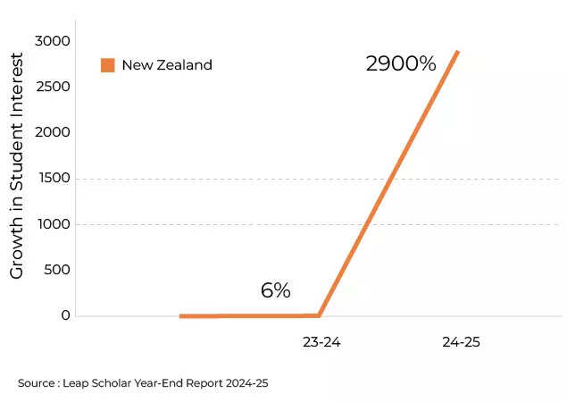 New Zealand’s spike in Indian student interest looks less like a PR victory and more like a collective pivot away from uncertainty. The Leap Scholar study captures the turn in blunt numbers: Interest in New Zealand was almost flat at 6% in 2023–24, then shot up by 2,900% in 2024–25.