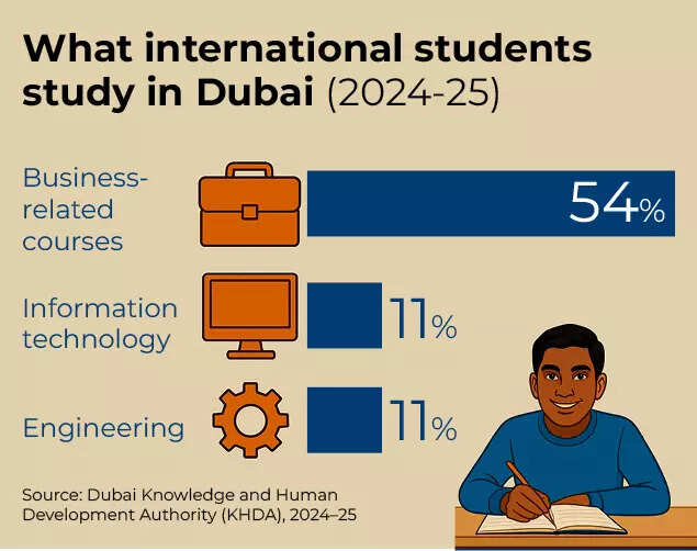 Programme choices mirror employability logic: 54% of international enrolments are in business-related courses, followed by information technology and engineering at 11% each, KHDA data shows.
