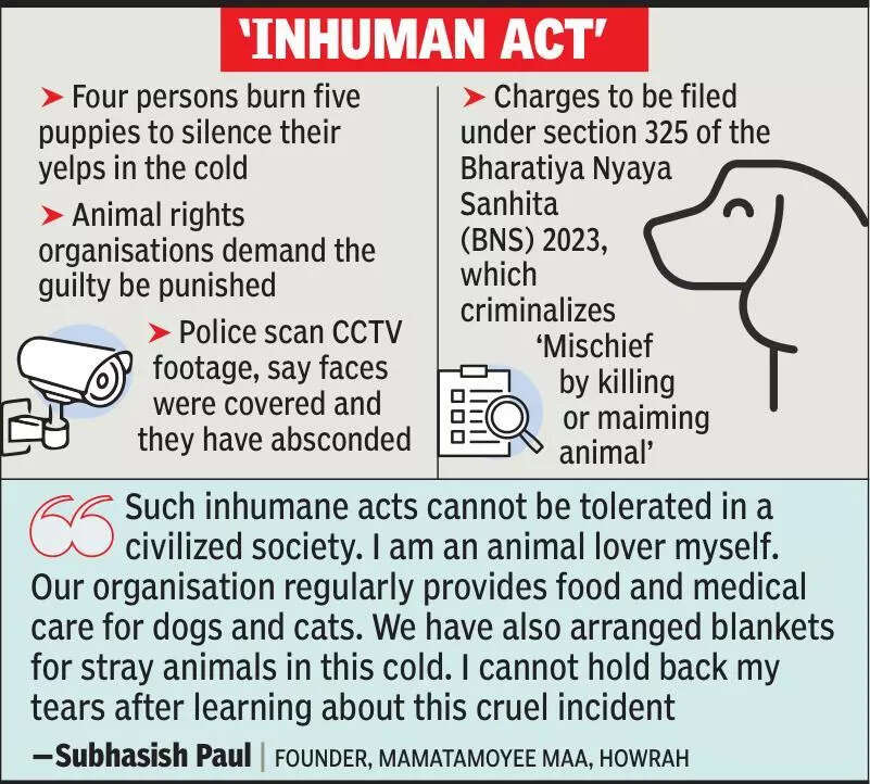 Four men allegedly burned five puppies to death in Howrah after being annoyed by their cries in the cold. The mother dog was also injured. Animal lovers have protested, demanding swift punishment for the perpetrators, who are currently at large as police investigate.