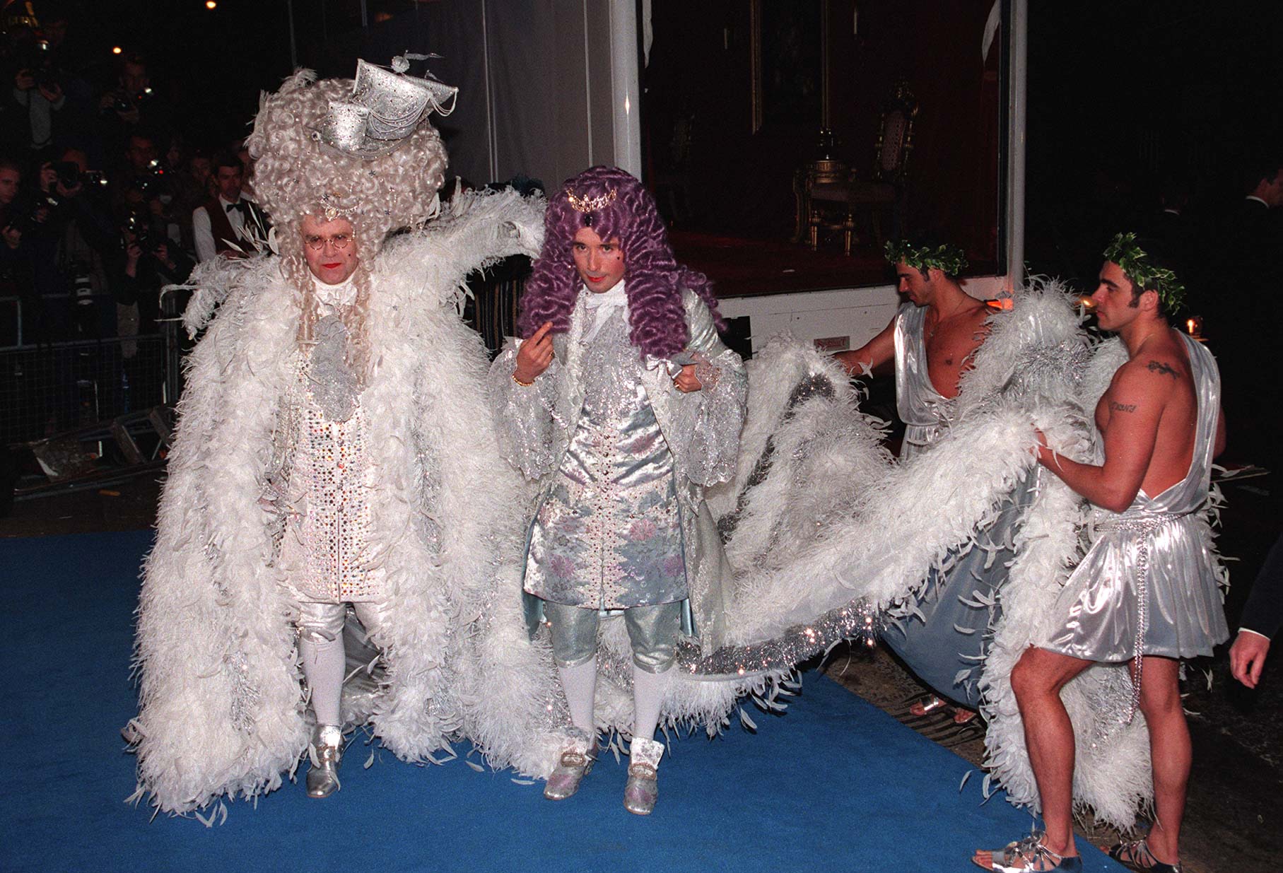 Elton John's Louis XIV-inspired 50th birthday outfit was transported on a mannequin, but the elaborate headdress had to be packed separately. (Supplied: UK Press via Getty Images)