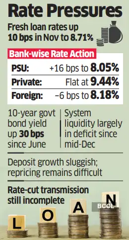 MUMBAI: Weighted average lending rates on fresh rupee loans across the banking system rose by 10 basis points to 8.71% end-November, central bank data showed. One basis point is a hundredth of a percentage point.