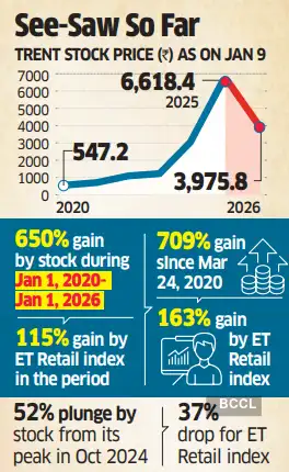 The company that pursued an aggressive store expansion strategy in recent years plans to keep adding new outlets in areas where it already has a presence in big cities, as well as move to smaller markets, in the current phase. Amid its quick spread, Trent's stock has seen peaks and troughs. While shares gained nearly seven-and-a-half times since the pandemic, they are down more than a third this past year. The scrip ended near its 52-week low, at ₹3,975.8, on the BSE on Friday.