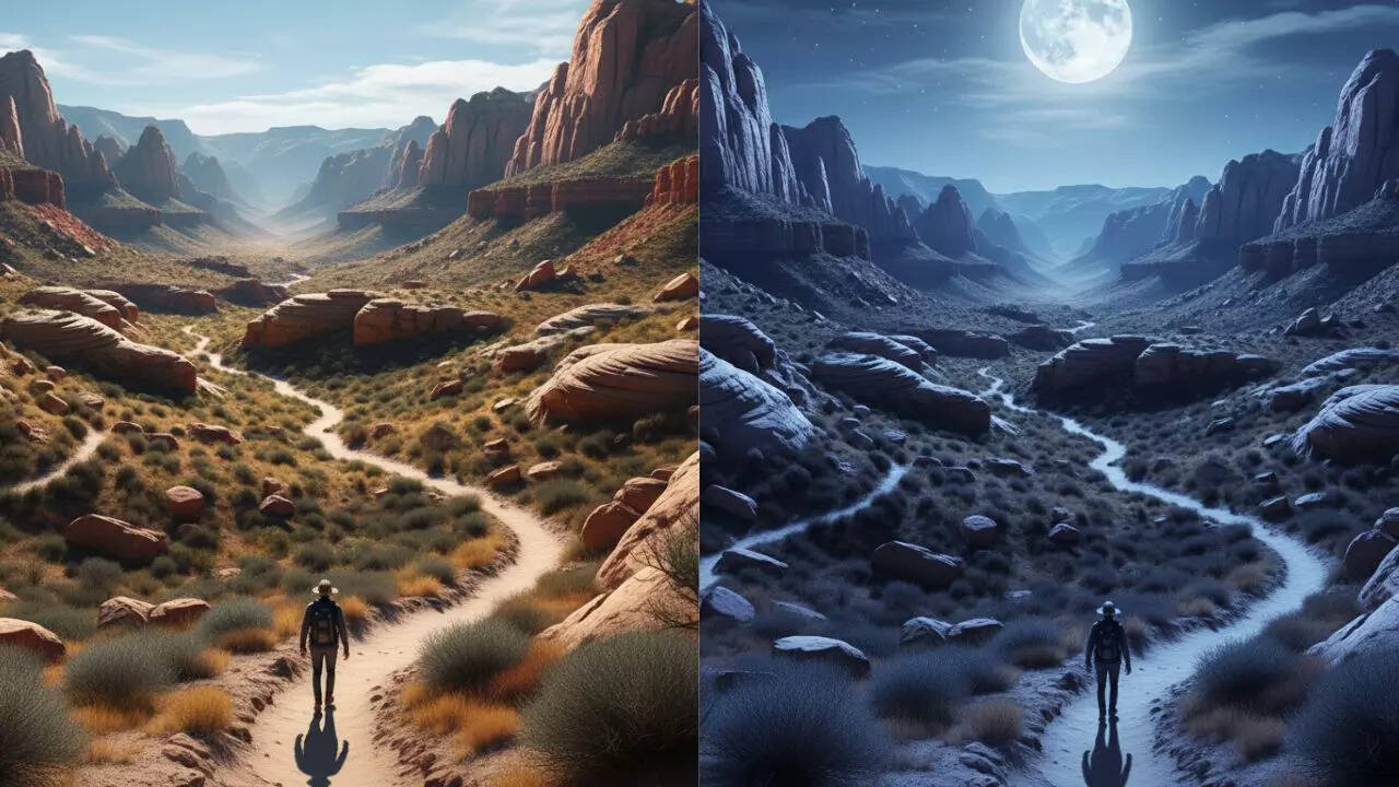 Prompt: "Transform this daytime hiking photo in the canyon into a moonlit night scene with dramatic shadows and a soft blue tint, keeping the terrain realistic."
