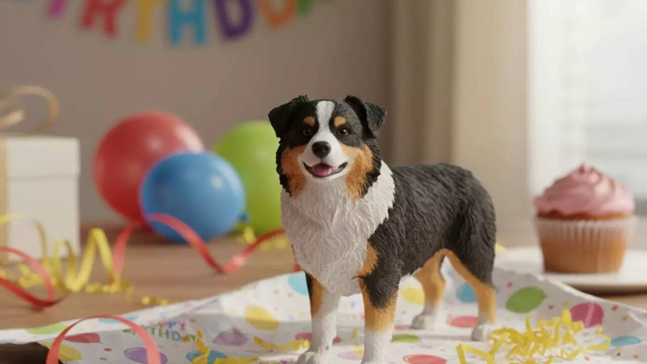 Prompt: "Create a realistic small 3D model of this dog and place it on a table with birthday wrapping paper as if it were just unwrapped."