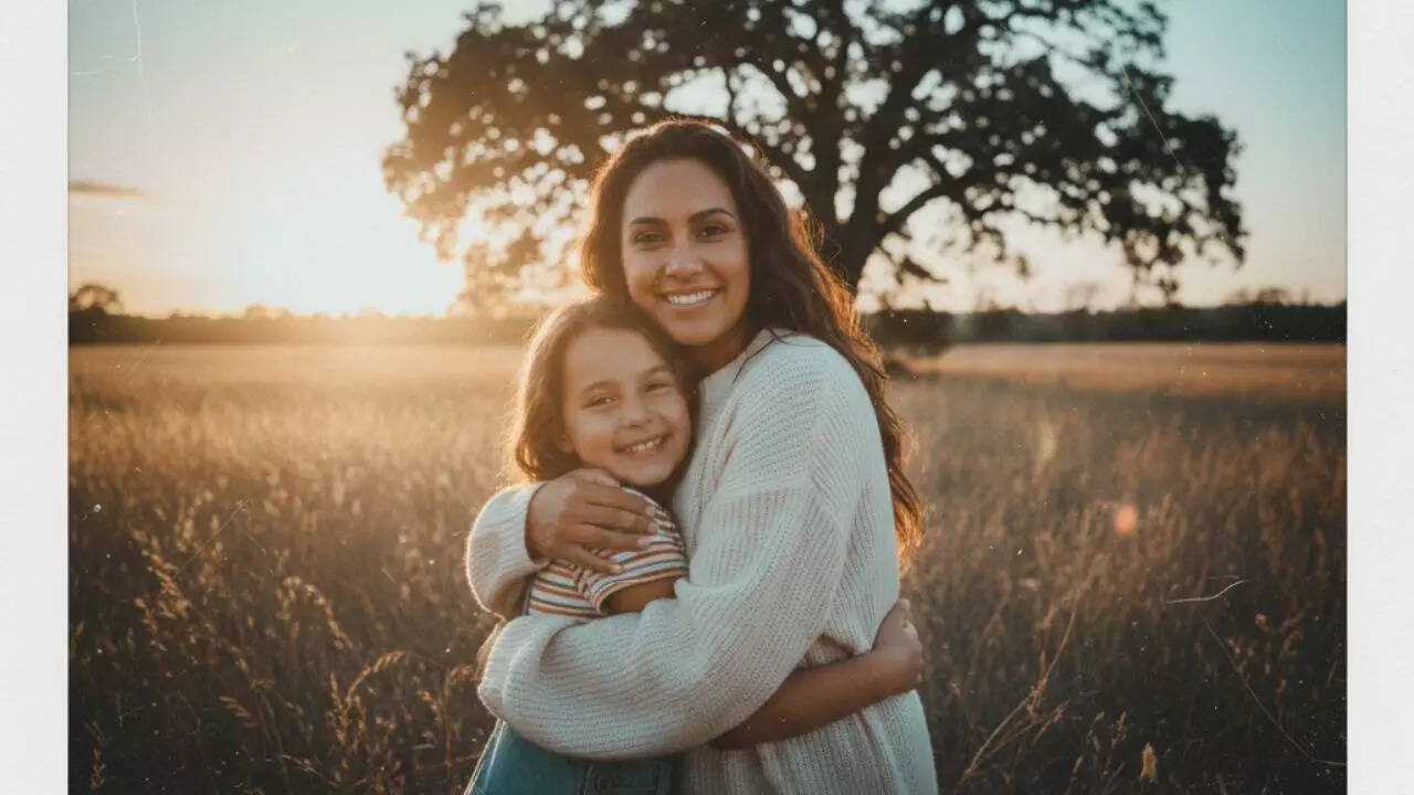 Prompt: "Combine these childhood and adult photos to show me hugging my younger self, in the style of a Polaroid photo with soft, natural lighting."