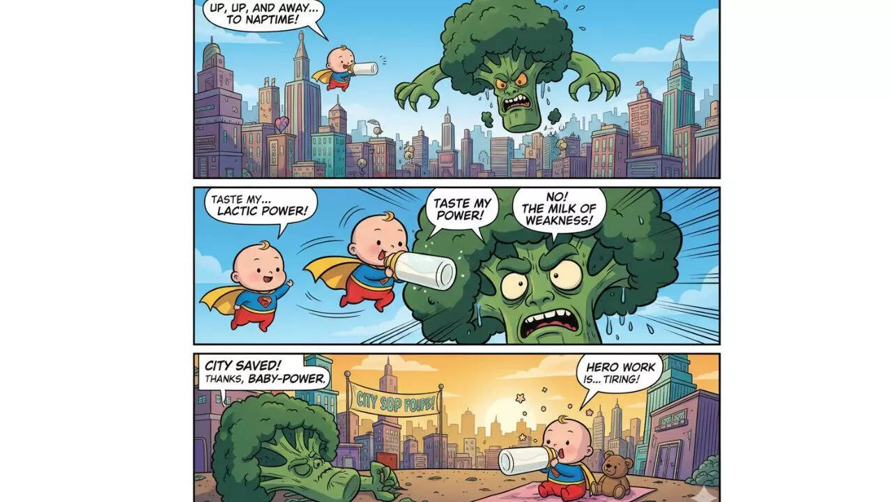 Prompt: "Make a 3-panel comic strip about a baby superhero saving a city from a giant evil broccoli in a colourful cartoon style."