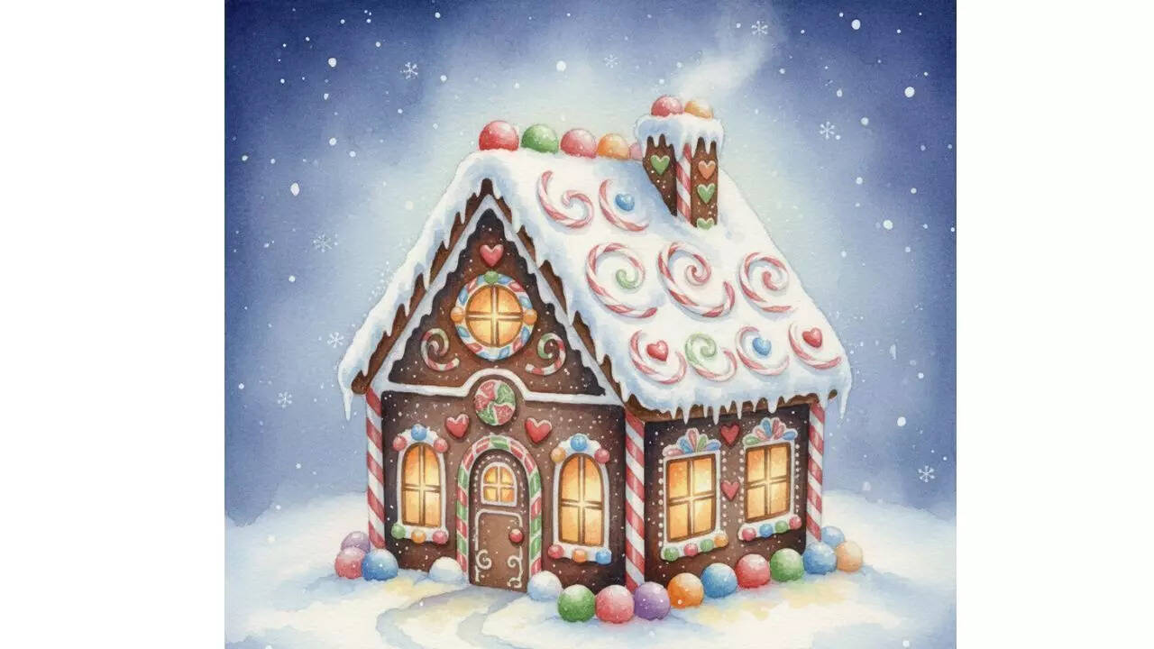 Prompt: "Create a cozy watercolor painting of a gingerbread house with warm lighting and soft snow around it."