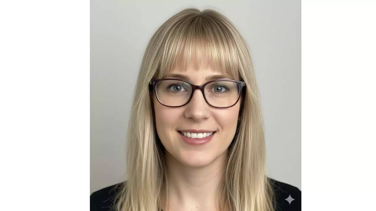 Prompt: "Show me with blonde hair and bangs while keeping my facial features and glasses unchanged."