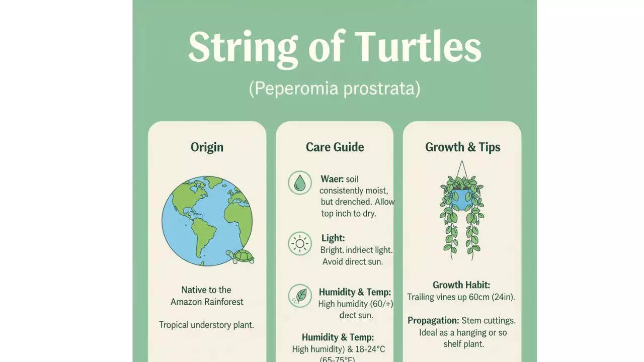 Prompt: "Generate an infographic for the String of Turtles plant with details on care, origin, and growth, using clean, readable layout."