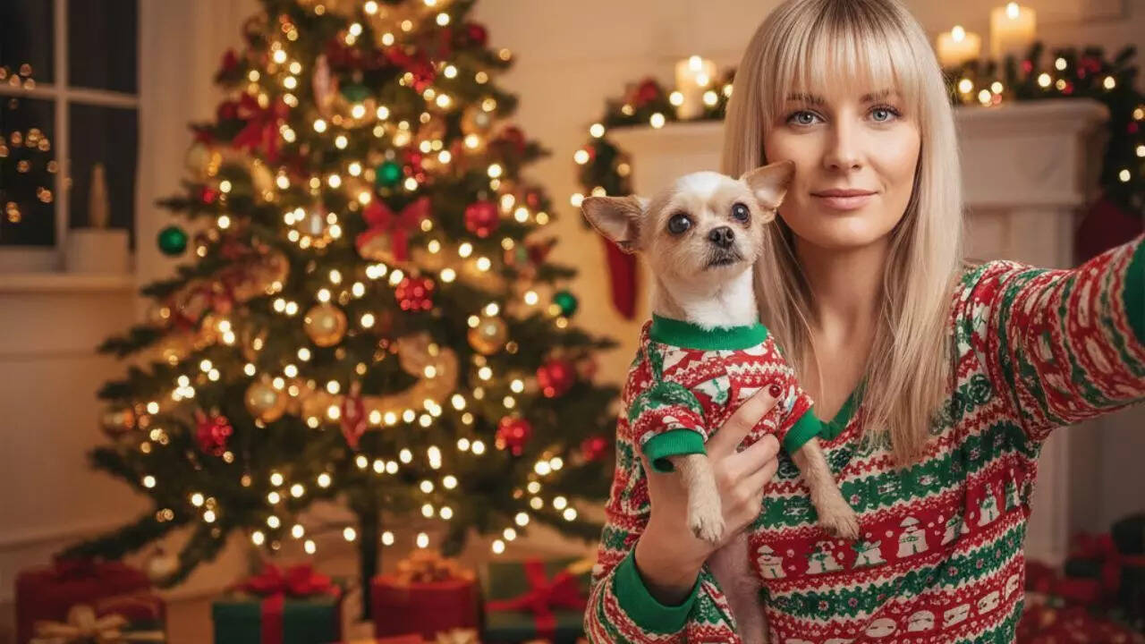 Prompt: "Transform this selfie with my dog into a Christmas scene with both of us in red and green pajamas, in front of a decorated tree, with gifts around us."
