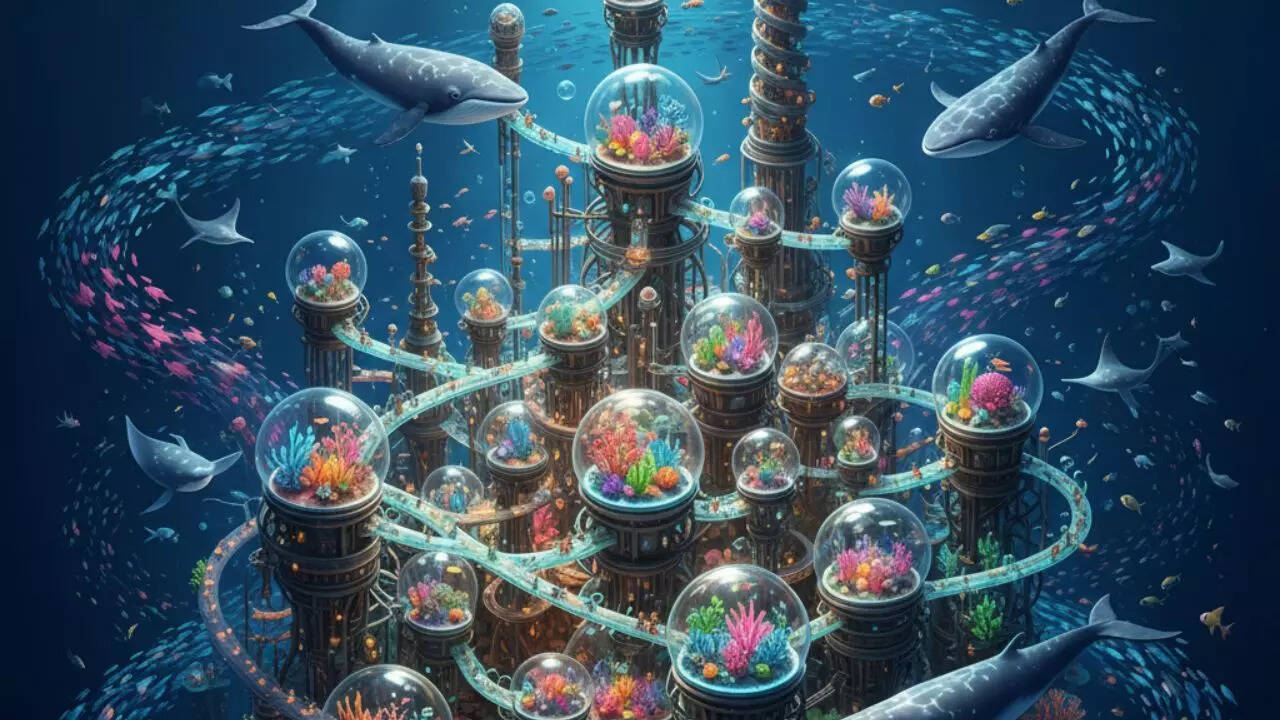 Prompt: "Create a 3D isometric image of a fantastical underwater city with spheres, tubes, and swimming sea life."