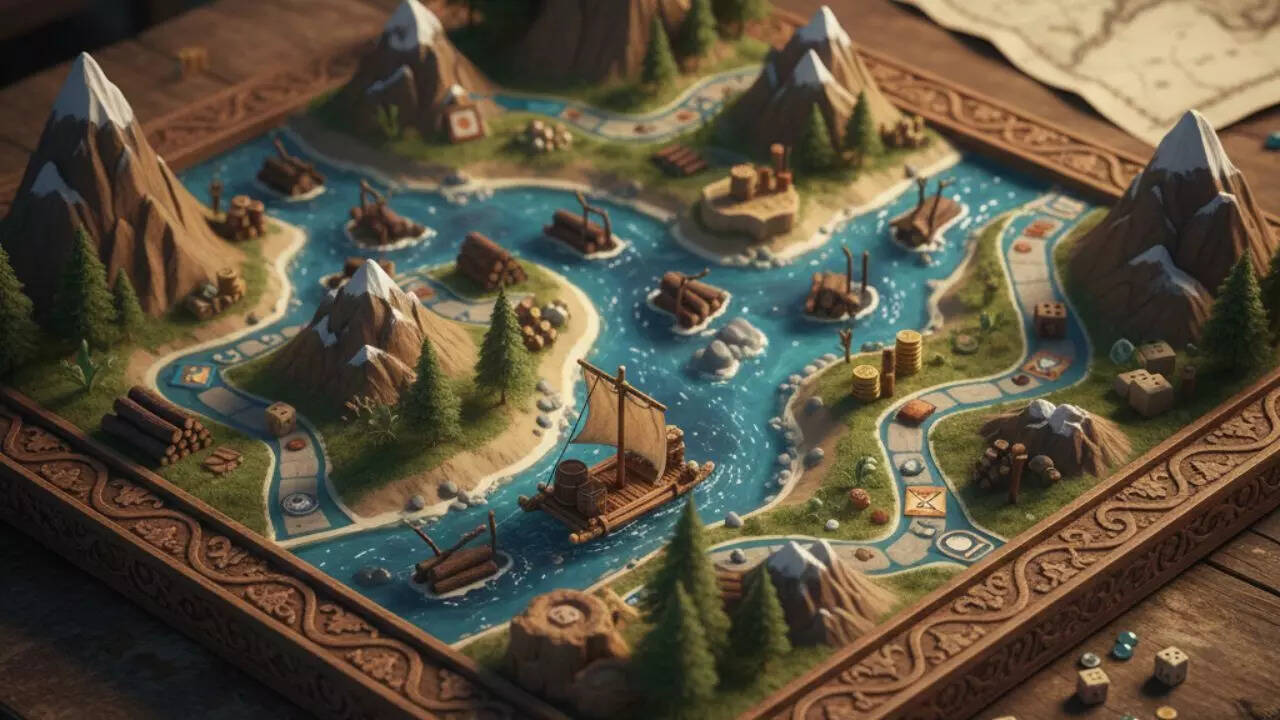 Prompt: "Turn this river landscape into a photorealistic rustic game board with a raft piece navigating obstacles."