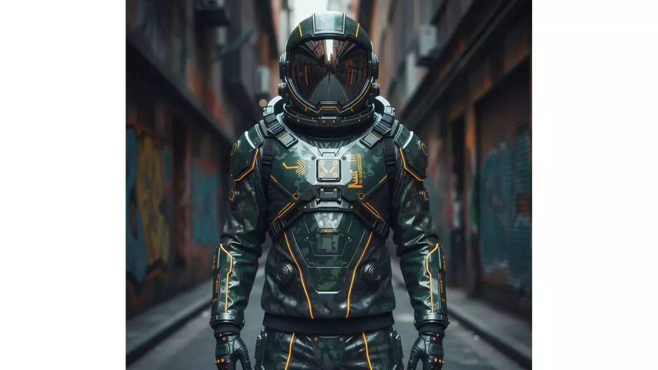 Prompt: "Transform my streetwear outfit into a shiny astronaut suit using the same colours and patterns."
