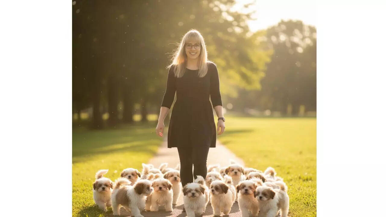 Prompt: "Create an image of me walking surrounded by fluffy shih tzu puppies in golden sunlight, keeping my face unchanged."