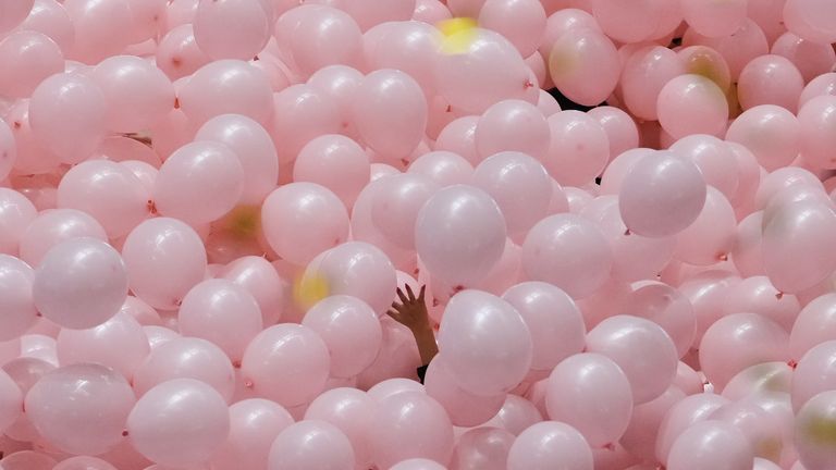 Image: A woman tries to catch falling balloons during the countdown at a Beijing shopping mall. Pic: AP