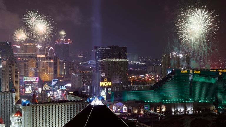 Image: Fireworks explode over Las Vegas casinos during New Year celebrations. Pic: AP