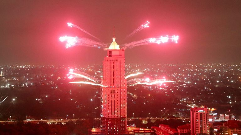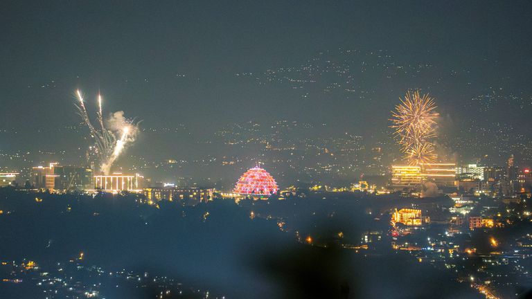 Image: Fireworks explode over the Kigali Convention Centre in Rwanda. Pic: Reuters