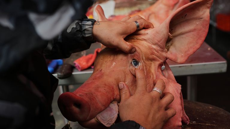 Image: A butcher checks the eyes of a pig head as clients buy meat for New Year's Eve in Mexico City. Pic: AP