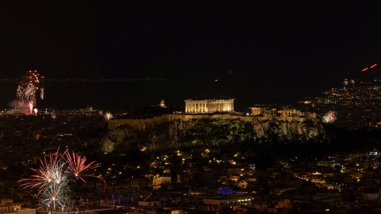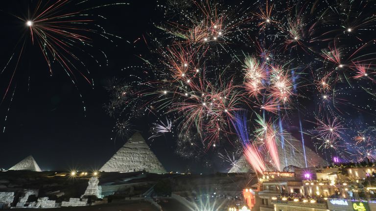 Image: Fireworks over the historical site of the Giza Pyramids, on the outskirts of Cairo, Egypt. Pic: AP