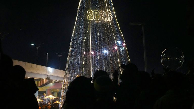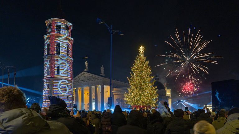 Image: People celebrate New Year at the Cathedral Square in Vilnius, Lithuania. Pic: AP