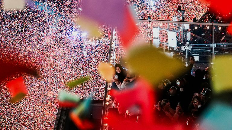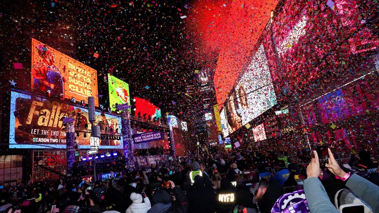 Image: Confetti fall over attendees in Times Square, New York. Pic: AP