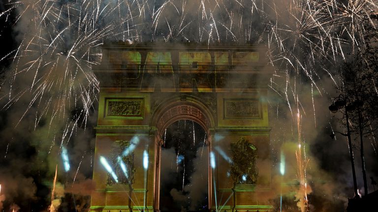 Image: Fireworks explode as the word "Paris" is projected onto the Arc de Triomphe on the Champs Elysees. Pic: Reuters