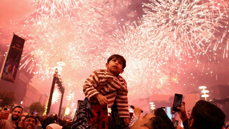 Image: A child looks up as fireworks explode in Lusail, Qatar. Pic: Reuters